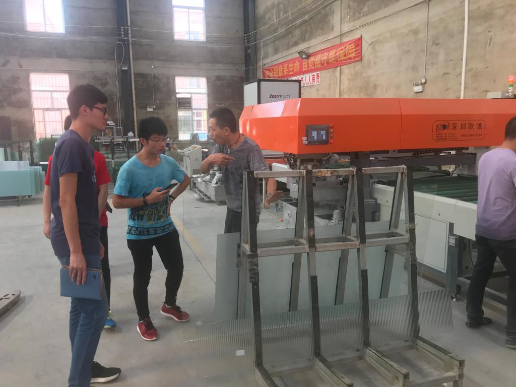 7月15 日上午8点,队员来到了第二家实习的工厂,一家制作钢化玻璃的工厂。在这里,他们将亲眼目睹一个普通玻璃向钢化玻璃的蜕变。负责人细心地为他们讲解了玻璃的制作工艺,队员们都聚精会神地边听边思考。一个普通玻璃的蜕变要经过切割、磨边、钢化、710摄氏度的高温后再风冷。在过程中,那些器械的巧妙运作让他们感受到了机械的魅力,发现了许多课本上的知识在实际生产中的运用,同时也学习了许多平时不曾了解过的知识,他们不禁感叹道:实践出真知,同时也激发了他们学习了热情。
